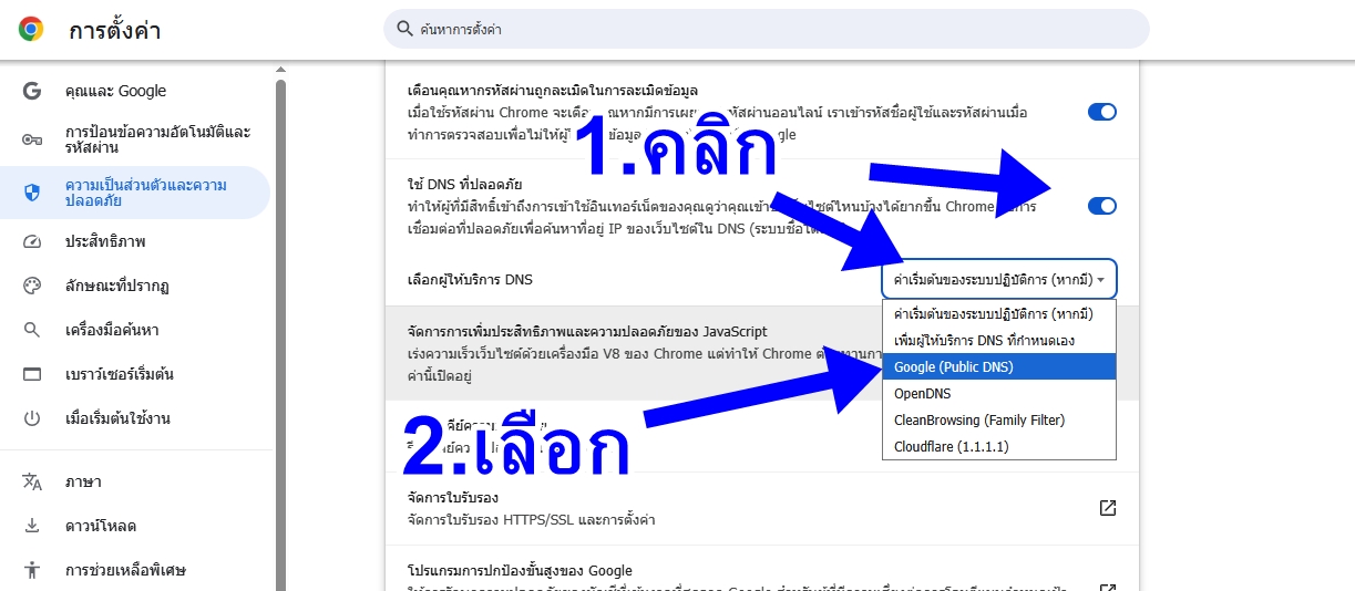 3.คลิกเลือกผู้ให้บริการ DNS แนะนำเลือก Google หรือ Cloudflare