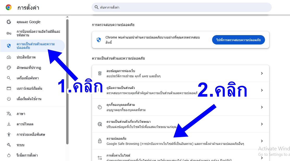 2.คลิกเมนู Privacy and security (ความเป็นส่วนตัวและความปลอดภัย) จากนั้นคลิก ความปลอดภัย ดังรูป