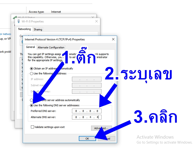 7. ติ๊กเลือก Use the following DNS server addresses: จากนั้นกำหนดค่าใน Preferred DNS server: เป็น 8.8.8.8 และกำหนดค่า Alternate DNS server: เป็น 8.8.4.4 แล้วคลิก OK